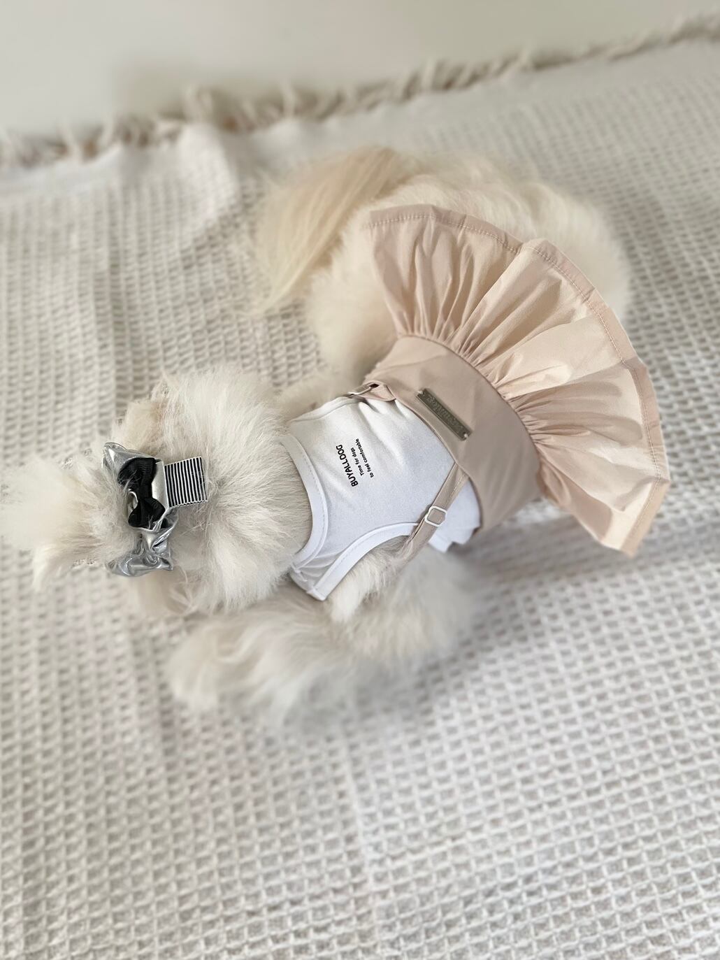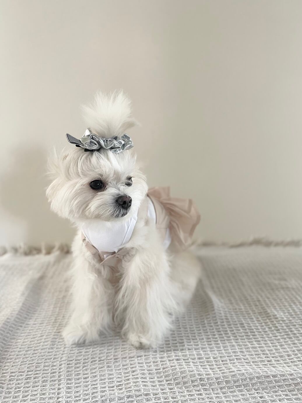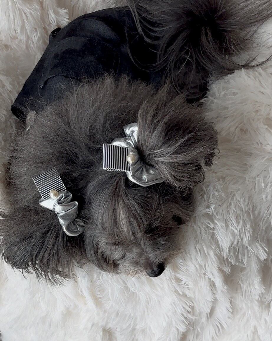 ビブとおそろいで着けられるシルバーのイヤーシュシュとヒト用シュシュとなります